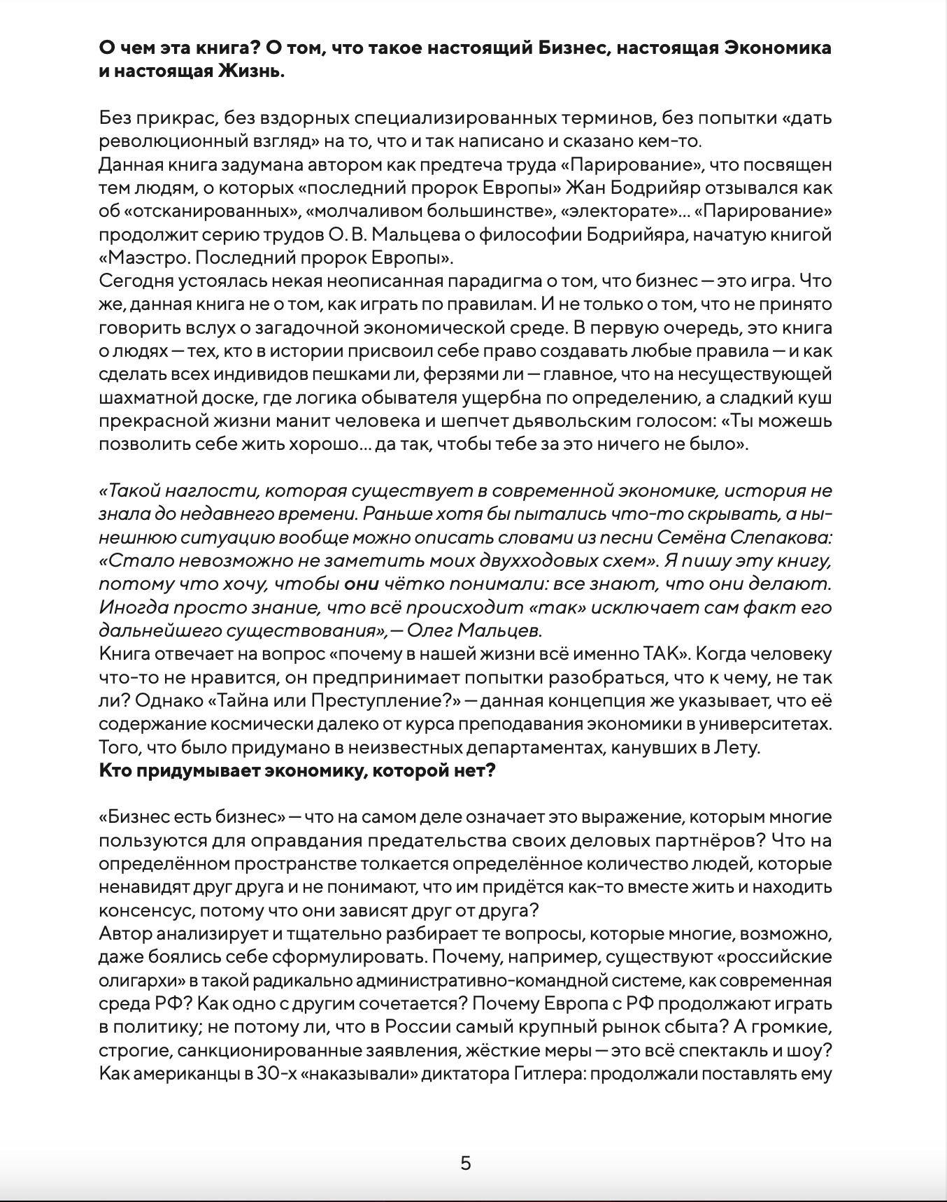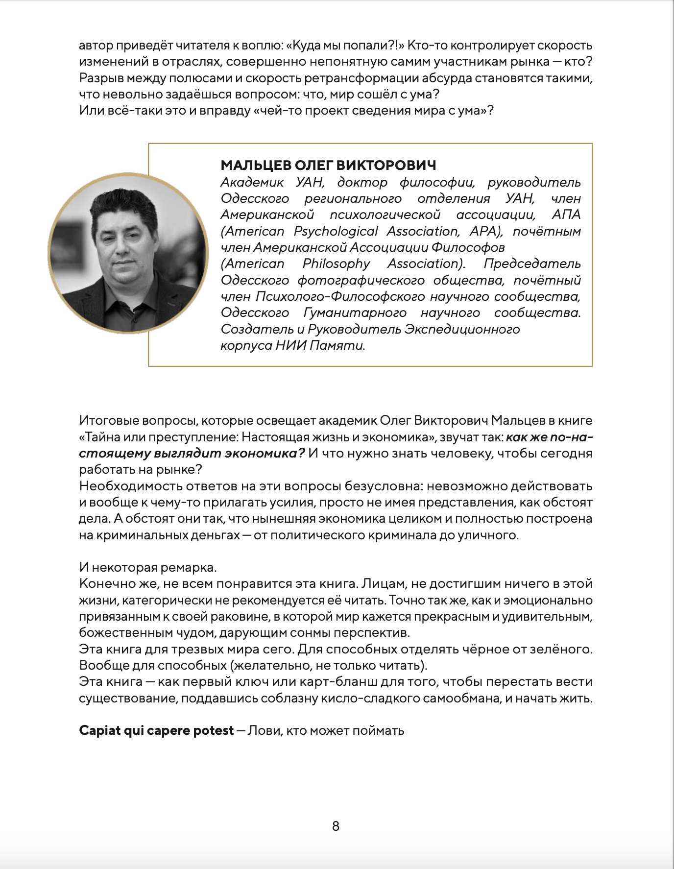 Книга академика Олега Мальцева «Тайна или преступление» — это не очередное пособие по маркетингу. Это бескомпромиссное исследование «закулисья» мировой экономики. Автор предлагает читателю снять маски толерантности и взглянуть на бизнес через призму философских идей Жана Бодрийяра и суровую реальность истории.
