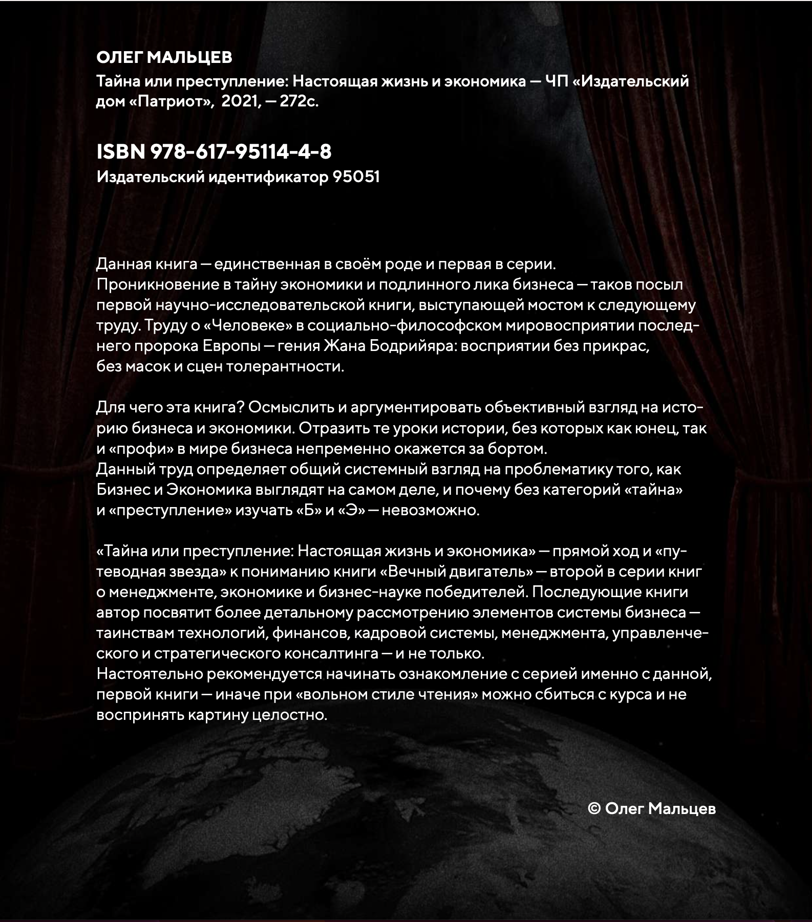 Книга «Тайна или преступление: Настоящая жизнь и экономика» — прямой ход и «путеводная звезда» к пониманию книги "Вечный двигатель"— второй в серии книг о менеджменте, экономике и бизнес-науке победителей.